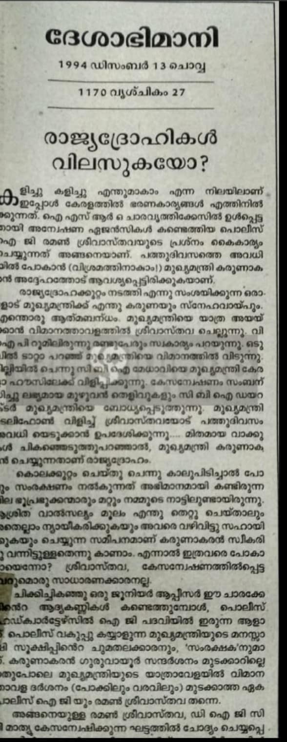 ചാരക്കേസ് വാർത്ത എല്ലാ മലയാള മാധ്യമങ്ങളും കൊടുത്തു എന്നും ഇന്ത്യ ടുഡേ യിൽ മാത്രമാണ് നിക്ഷപക്ഷമായി വാർത്ത കൊടുത്തതെന്നും ചില ഓൺലൈൻ മാധ്യമങ്ങളിൽ കണ്ടു. അതു സത്യം ആണെങ്കിലും മുഴുവൻ സത്യമല്ല.